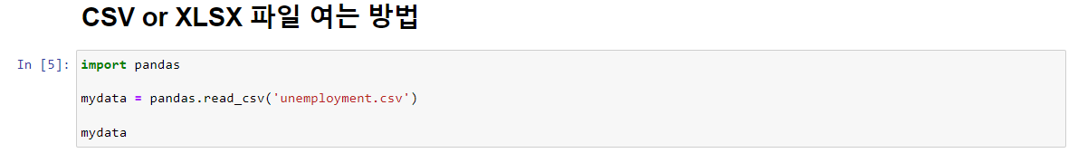 이 다운받은 엑셀파일을 주피터 노트북에서 한번 오픈을 해봐야 겠죠? 엑셀파일의 오픈은 아래와 같이 진행해주시면 되십니다.