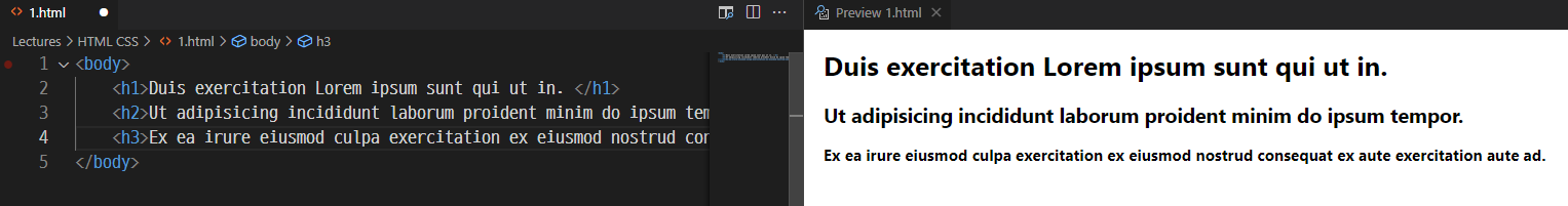 동일하게, h2와 h3에도 로렘입숨을 입력해주면 위의 html preview와 같이 간단하게 시각적으로 어떻게 반영되는지를 볼 수 있게 된다.