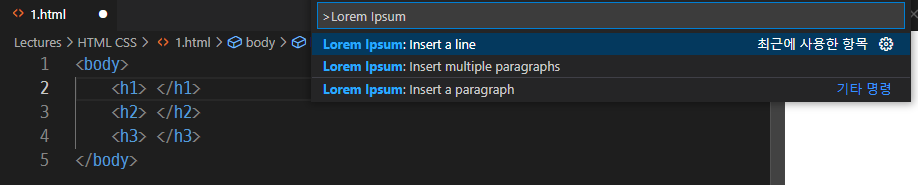 h1, h2, h3은 각각의 폰트 크기가 달라지게 나올 것이다. 근데 이 h1 사이에 글을 적어야 하는데 아무글이나 적자니 뭘 적어야 할지도 모르겠고, 생각을 하기도 귀찮다. 나는 그냥 아무 글이나 써서 h1과 h2 사이에 어떠한 차이가 있는지만 보고 싶은 것이다.