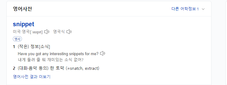 오늘은 구글 스니펫 (Google Snippet) 이라고 하는 것에 대해 알아보며, 어떻게 선정이 되는지에 대해 알아 보겠습니다. 스니펫이라는 말은 생소하실 수 도 있는데요, 사전적 의미로는 "작은 정보 소식", "한 토막" 이라고 나와 있는 것을 알 수 있습니다.