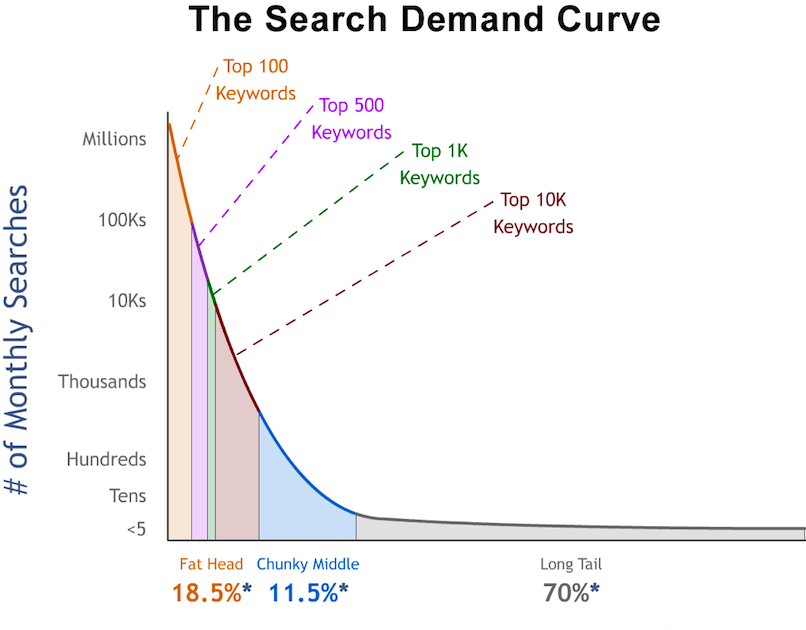 키워드의 종류에는 크게 두가지가 있다. 바로 숏테일 키워드와 롱테일 키워드라고 하는 것이다. 아래는 The Search Demand Curve라고 하는 그래프 입니다.
