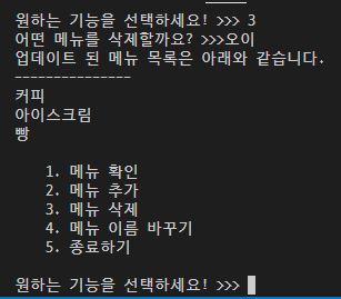 마찬가지로 어떤 메뉴를 삭제할까요? 라는 질문이 나오고, 입력을 하면 해당 메뉴가 지워 집니다.