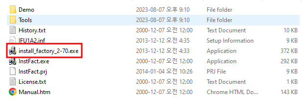 위 파일의 압축을 푼 후 아래 사진의 install_factory_2-70.exe 를 더블클릭하여 설치 해주시면 됩니다.