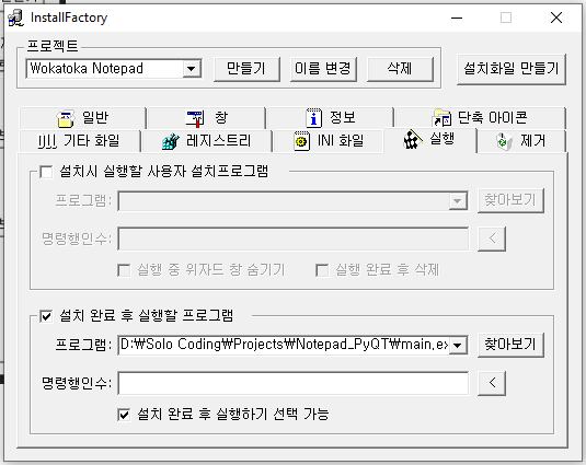 - 설치 완료 후 실행할 프로그램: 설치 완료하면 나올 프로그램 (exe파일)을 지정합니다.