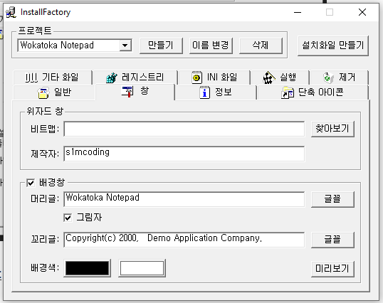 - 배경창 (머리글 / 꼬리글): 설치파일 내의 배경색과 머리글/꼬리글을 지정합니다. 미리보기를 통해 확인 후 진행할 수 있습니다.